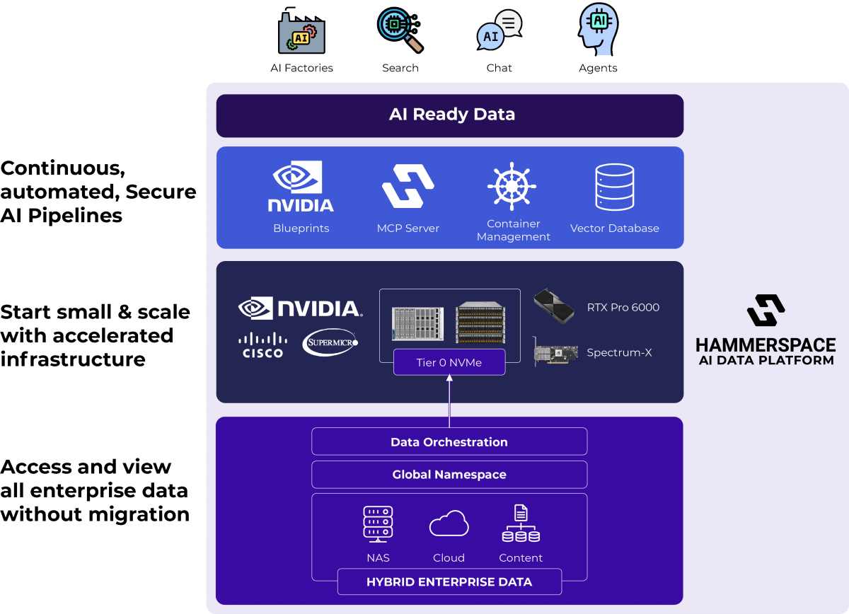 Delivering a validated, easy-to-deploy solution, Hammerspace's Data Platform facilitates scalable AI adoption in small, project-based configurations through strategic partners. It offers enterprises a practical means to bridge data access challenges, transforming owned data into AI-ready intelligence.